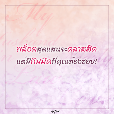 อกเกือบหักแอบรักคุณสามี พล็อตคลุมถุงชน แต่งงานกันเพราะความจำเป็น เห็นบ่อยแล้วพล็อตแบบนี้แต่เดี๋ยวก่อน! สำหรับเรื่องของ “เธียรวัฒน์” และ “นทีริน” สถาปนิกสุดหล่อแบดบอย กับ มัณฑนากรสาวแสนสวยสุดน้องสาวนอกไส้คนนี้ของเขานั้นแตกต่าง ยัยเมยที่ทำตัวเฮฮาไปวันๆ แต่แอบซ่อนเขี้ยวเล็บไว้ข้างในภายใต้หน้ากากใสซื่อ ที่มีแต่พระเอกของเราเท่านั้นแหละที่ตามทัน แต่ก็ใช่ว่าจะจับได้ทุกเรื่องนะจ๊ะ อิอิ แถมจุดเด่นของเรื่องนี้ที่ประทับใจคนอ่านมากที่สุดก็คือความรักที่ยิ่งใหญ่และมั่นคงของนางเอก ที่จะพาคุณน้ำตาซึมและซาบซึ้งไปกับเธอ นอกจากนี้เรื่องนี้ยังมีความคอมเมดี้ที่เป็นกิมมิคเด่นแอบซ่อนอยู่เพราะนางเอกของเรานั้นสายรุก สายหยอดหนักมาก แถมวิธีการจีบพี่เธียรของเธอก็ไม่เหมือนใคร ทั้งฮาและน่ารักอ่านแล้วคุณจะต้องขำและอมยิ้มไปกับความรักของทั้งคู่ตลอดทั้งเล่มได้อย่างแน่นอน นี่ก็เป็นอีกเล่มที่ไม่ควรพลาดเช่นกัน