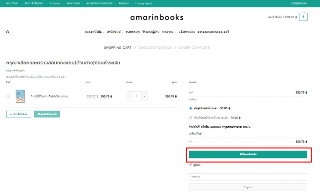 3.ตรวจสอบรายละเอียดการสั่งซื้อแล้วเลือกวิธีการจัดส่ง เมื่อถูกต้องแล้วกดที่ปุ่มดำเนินการสั่งซื้อและชำระเงิน