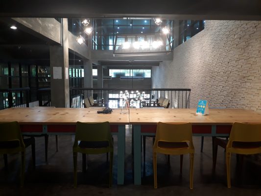 เมื่อขึ้นมาที่ชั้น 2 ของคาเฟ่หนังสือที่นี่ก็จะพบกับพื้นที่โล่งกว้างขวาง มีโต๊ะขนาดใหญ่หลายตัวเตรียมไว้สำหรับใครก็ตามที่จะมานั่งทำงาน ที่สำคัญ โซนนี้เขาให้ใช้ฟรีนะ ไม่ต้องเสียค่าบริการ